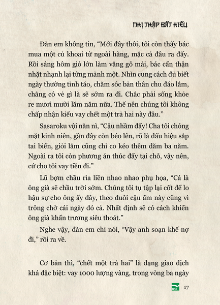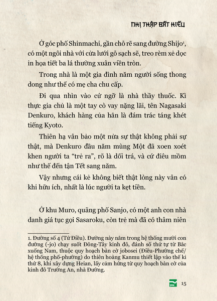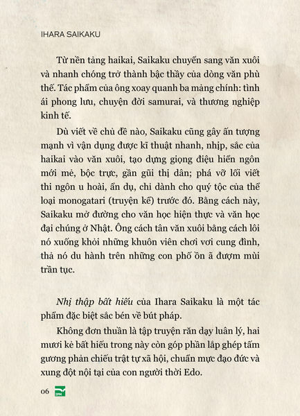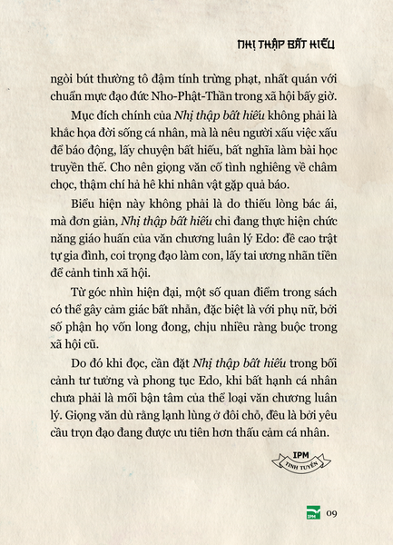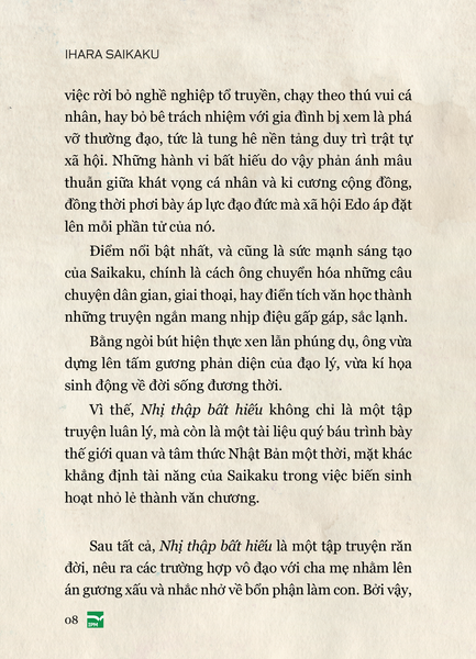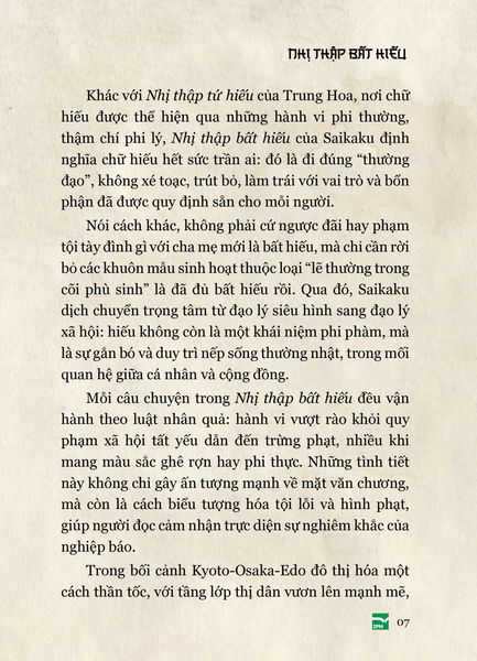 Nói đến văn học cổ điển Nhật Bản, ấn tượng thường xuyên là samurai, anh đào, thiền định, mổ bụng… cho nên Nhị thập bất hiếu là cơ hội quý giá để tiếp cận một góc khuất đầy thú vị của văn chương xưa kia ở xứ sở này, nơi cái ác được kể với một sức hút kì lạ, và bài học đạo đức được rút ra từ chính sự đảo điên của vô đạo đức.
